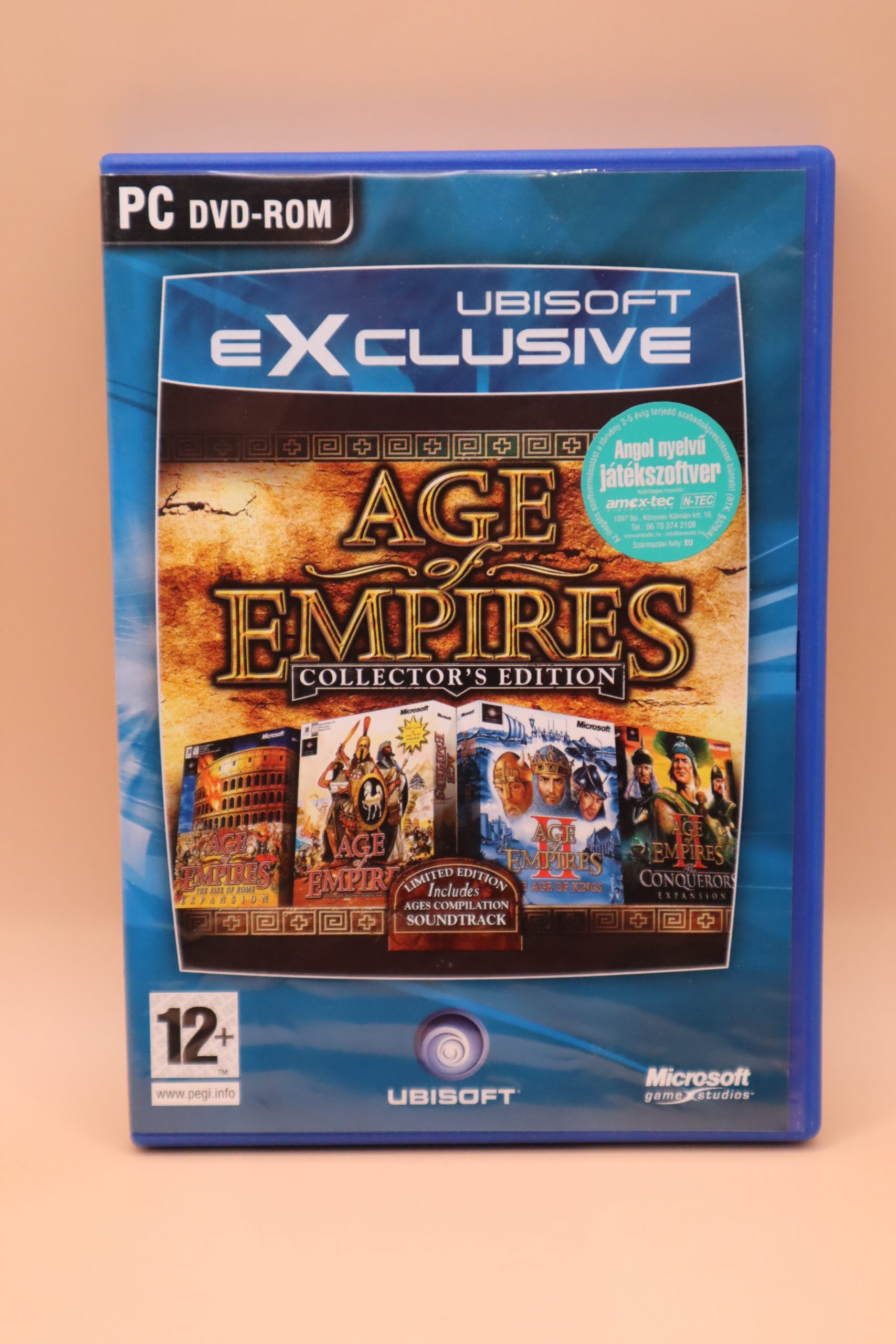 Valósidejű stratégiai játékok. Kiadás éve: 2000. Platform: Windows 95/98/ME/NT/2000. Kivitel: dvd tokos, Ubisoft Exclusive kiadás, magyar/angol feliratos borító, eredeti dvd, angol, német, francia, spanyol nyelvű játékok. Ez a kiadás tartalmazza az Age of Empires alapjátékot, a The Rise of Rome kiegészítőt, az Age of Empires II: The Age of Kings alapjátékot és a The Conquerors kiegészítő lemezt. DVD állapota: karcmentes, újnak tűnik