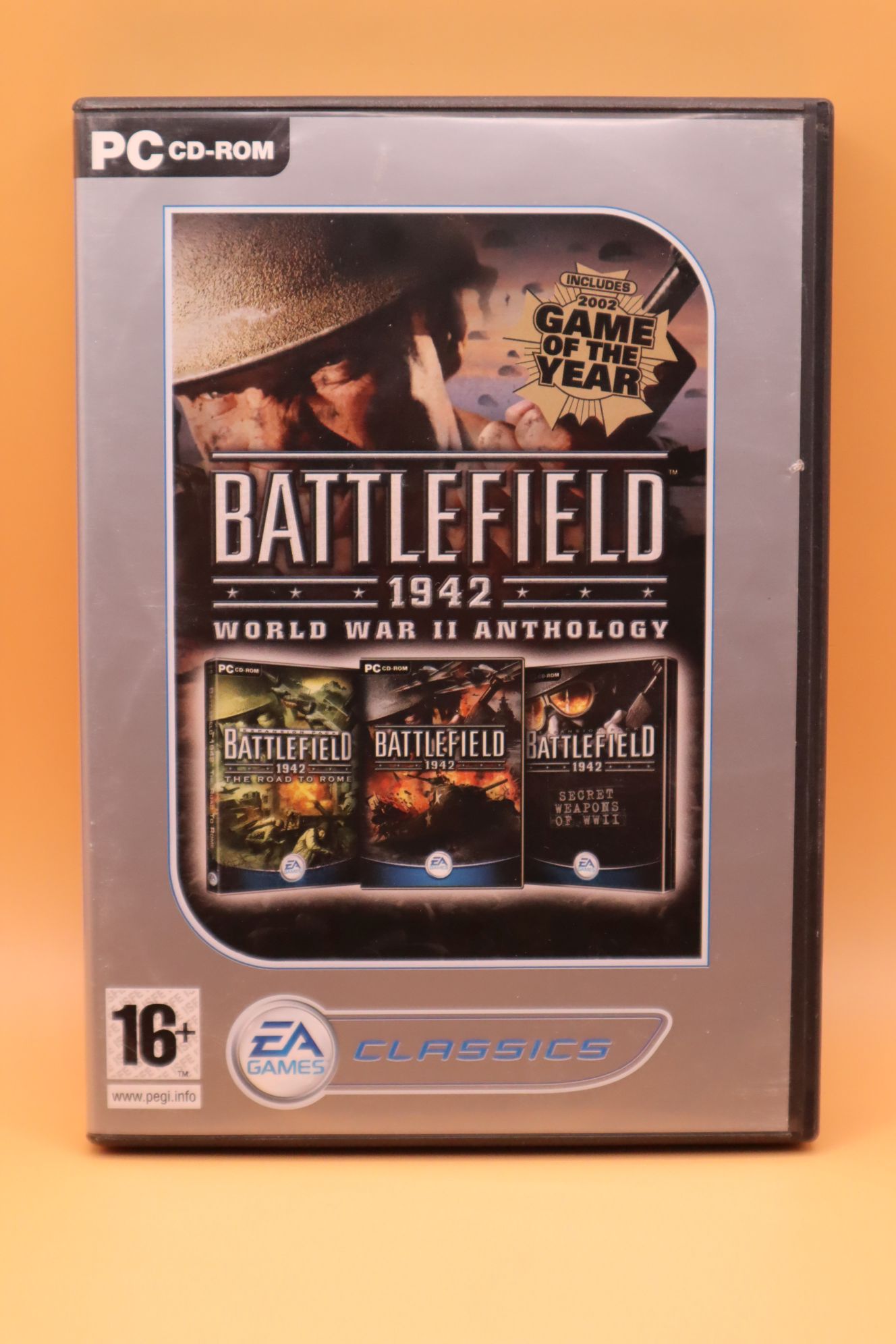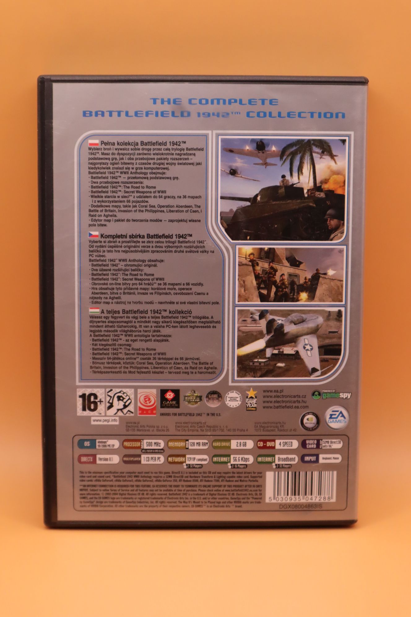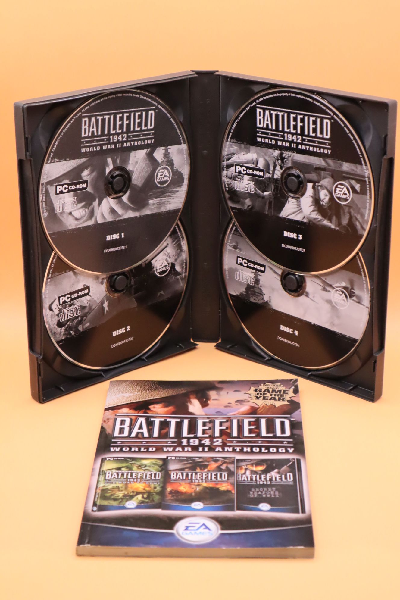 Belső nézetes lövöldözős játék (FPS). Kiadás éve: 2004. Platform: Windows 98/ME/2000/XP. Kivitel: vastag dvd tokos, utánkiadás, magyar/lengyel/cseh feliratos borító, magyar/lengyel/cseh nyelvű papírkézikönyv, eredeti 4 cd, angol és német, francia, olasz, spanyol, japán, koreai, kínai nyelvű játék. A kiadás tartalmazza a Battlefield 1942 alapjátékot, a The Road to Rome és a Secret Weapons of WWII kiegészítő lemezeket. 2002 Game Of The Year kiadás! CD-k állapota: karcmentes, újnak tűnik. Telepítőkód megvan, valószínűleg el lett használva internetes multiplayerre, offline játékra alkalmas biztosan.