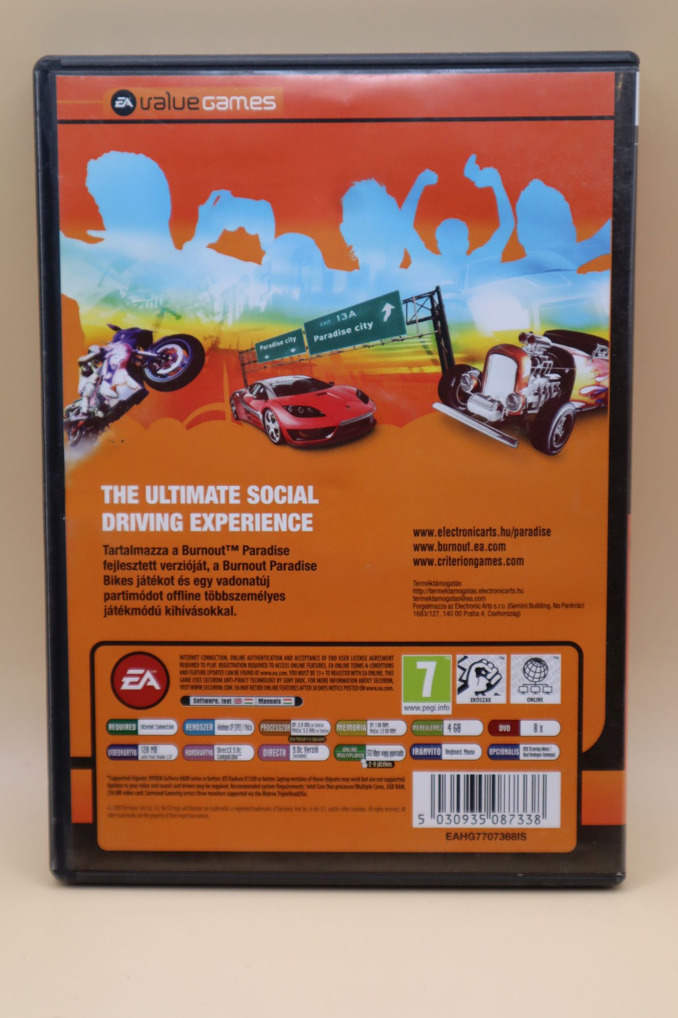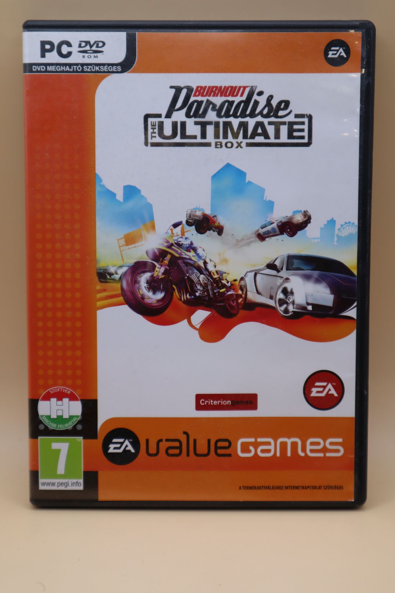 Autóversenyzős játék, tartalma: Burnout: Paradise + Cagney Pack + Bikes Pack + Party Pack kiegek. Kiadás éve: 2009. Platform: Windows XP/Vista. Kivitel: dvd tokos, után kiadás, magyar feliratos borító, eredeti dvd, magyar feliratos játék. DVD állapota: szinte karcmentes, tesztelt, működik. Megjegyzés: telepítéskor internetes aktiválás szükséges, de még van szabad aktiválás, telepíthető. Origin nem szükséges a futtatásához! EA fiókhoz valószínűleg már regisztrálva lett a sorozatszám, tehát online játékra valószínűleg nem alkalmas, offline használható.
