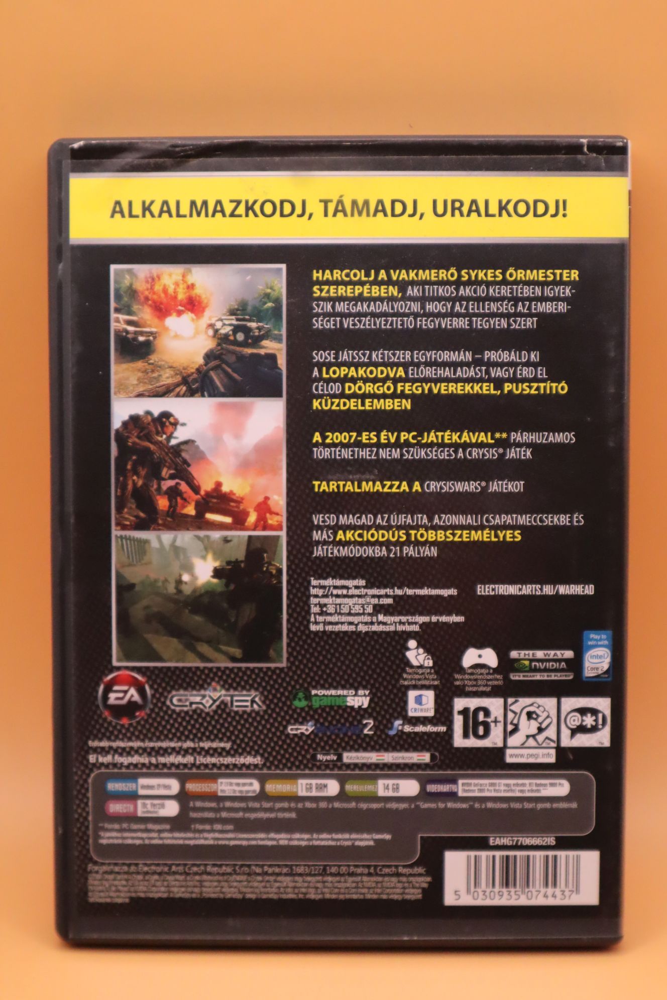 Belső nézetes lövöldözős játék (FPS). Kiadás éve: 2008. Platform: Windows XP/Vista. Kivitel: dvd tokos, EA Classics kiadás, magyar feliratos borító, magyar nyelvű papírkézikönyv, eredeti 2 dvd (tartalmazza a Crysis Wars multiplayer kiegészítőt is), magyar feliratos, angol, német, francia, olasz, spanyol, cseh, lengyel nyelvű játék. DVD-k állapota: karcmentes, újnak tűnik. Figyelem: A játék elindításához interneten aktiválás szükséges. Az aktiválási dátumellenőrzés nem működik már, le kell tölteni hozzá az EA oldaláról egy fájlt, hogy működjön. Az előző tulajdonos visszavonta az aktivációt, így szabadon telepíthető és használható.