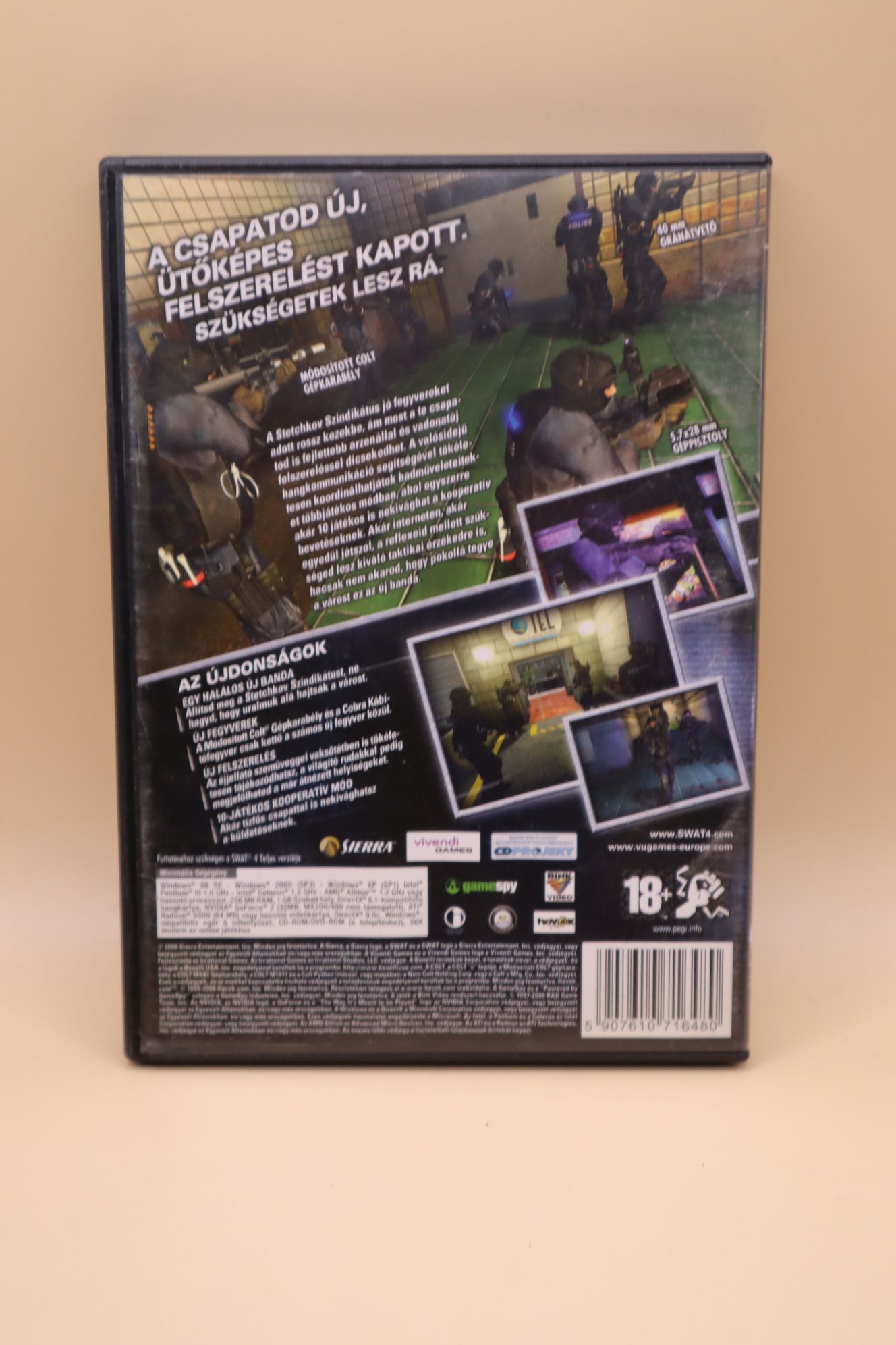 Taktikai lövöldözős játék. Kiadás éve: 2006. Platform: Windows 98SE/2000/XP. Kivitel: dvd tokos, első kiadás, magyar feliratos borító, magyar nyelvű papírkézikönyv, eredeti cd, magyar feliratos kiegészítő lemez, futtatásához szükséges a SWAT 4 alapjáték! CD állapota: enyhén karcos (hajszálkarcok), tesztelt, működik.